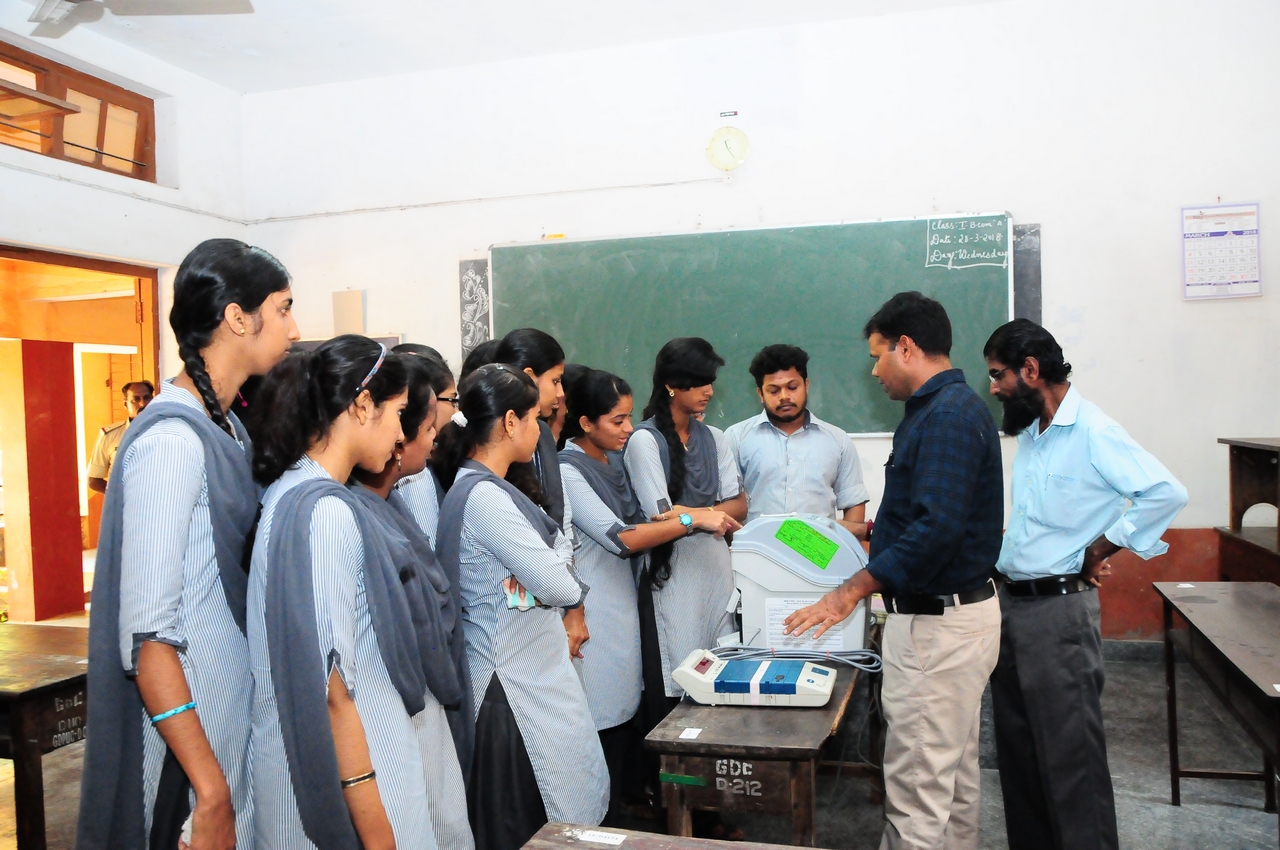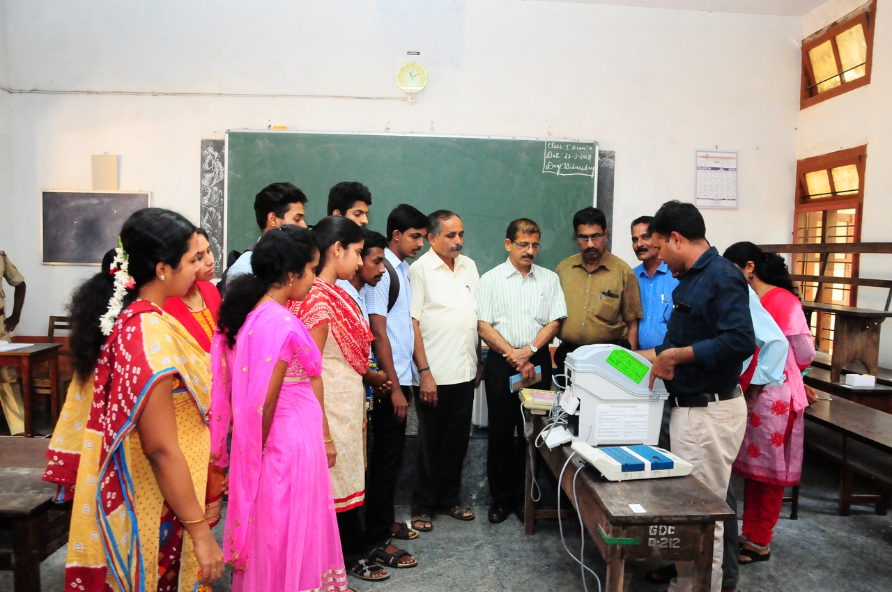 A demonstration of the Voter Verifiable Paper Audit Trial (VVPAT) was held at Govinda Dasa College, Surathkal on 16th Monday 2018. The VVPATs with electronic Voting Machines (EVMs) will be used in all the Constituencies in Dakshina Kannada District during the Assembly Elections. Speaking to faculty members and administrative staffs and students, Sri Ratnakar, Sector Officer of Krishnapura and Katipalla and Mr. Mohammed Ashraf, Sector Officer of Surathkal said that there will be a ballot unit, a control unit and a VVPAT unit in every polling station this time. Hence there will not be any doubt about the correctness of the voting process.