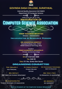 The Department of Computer Science at Govinda Dasa College, Surathkal organized the Computer Science Association Inauguration Programme on 27 September 2025 at 11:00 AM in the college’s Audio Visual Hall. The event formally marked the launch of the association’s academic and co-curricular activities for 2025–26.