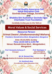 The Internal Quality Assurance Cell (IQAC) and Value Education Club of Govinda Dasa College, Surathkal, in association with Kuthethoor Govinda Dasa Charitable Trust, successfully organized a spiritual talk on “Moral Values and Social Responsibilities” on 05 October 2025 at Ramakrishna Mutt, Mangaladevi, Mangalore.