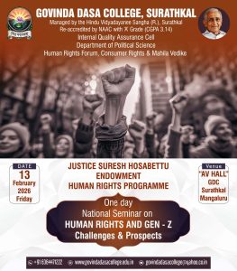 The Justice Suresh Hosabettu Endowment National Seminar on “Human Rights and Gen-Z: Challenges and Prospects” was organised at Govinda Dasa College, Surathkal on 20 February 2026. The seminar was conducted under the initiative of the Internal Quality Assurance Cell (IQAC), Department of Political Science, Human Rights Forum, Consumer Forum, and Mahila Vedike of the college.
