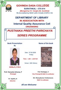 The Department of Library, in association with the Internal Quality Assurance Cell (IQAC) of Govinda Dasa College, jointly organized a programme under the Pusthaka Preethi Parichaya Series on 27th March 2026.